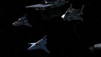 The Cylons launch a devastating attack on the fleet; the Myriad moves to take the brunt of the assault as the civilian vessels leave the belt and jump to safety. The Augea is left briefly exposed but the Raiders seem more interested in the Myriad than destroying the fleeing civilians. Both Basestars are heavily damaged and forced to withdraw but the Myriad takes a battering, losing half its hull integrity. The fleet limps to the edge of Colonial space, barely able to make use of FTL jumps.